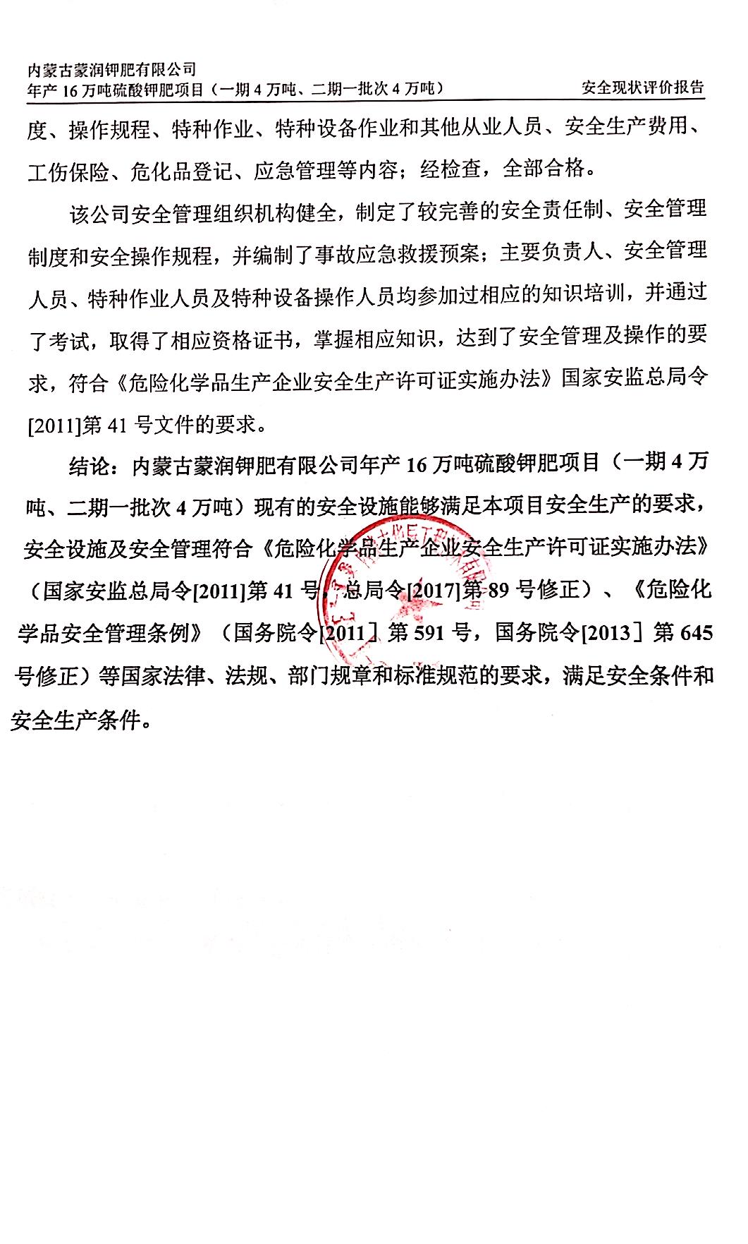 公司目前运行的年产8万吨硫酸钾肥装置是以氯化钾及硫酸为原料,经过复分解反应等工序生产硫酸钾肥,副产盐酸。 公司现有职工45人,成立专门安全部门——安全部,配备了专职安全管理人员1名,配备了1名注册安全工程师。 内蒙古蒙润钾肥有限公司于2025年5月26日取得《安全生产许可证》,证书编号:(蒙)WH安许证[2025]001101号,许可范围为:盐酸;有效期2025年4月28日至2028年4月27日。 内蒙古蒙润钾肥有限公司办理了危险化学品登记,登记品种:产品盐酸、原料硫酸,危险化学品登记证有效期至2027年5月17日。 该公司《内蒙古蒙润钾肥有限公司生产安全事故应急预案》于2025年5月12日在乌拉特前旗应急管理局备案,备案编号为:150823-2025-030。 |